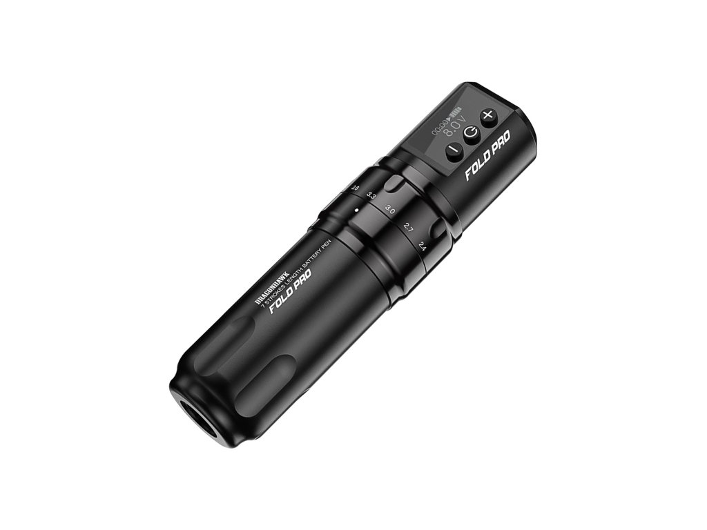 A Dragonhawk Fold Pro Wireless Pen egy sokoldalú tetoválógép azoknak a tetoválóknak, akik egy gépben szeretnének minél nagyobb rugalmasságot. 7 előre beállított stroke hosszt kínál 2.4 és 4.2 mm között, így finomabb vonalvezetéshez, lágy satírozáshoz és erősebb színbeviteli munkákhoz is könnyen beállítható.